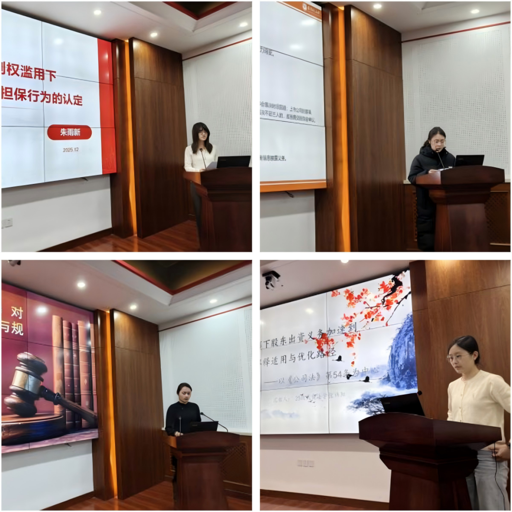 学术沙龙第一单元由2024级学硕研究生王姗姗主持。付思丽、朱雨新、张祎阳、赵晓静依次进行专题汇报,内容涵盖关联交易的法律规制、控制权滥用下公司例外担保行为的认定、非破产情形下股东出资义务加速到期制度之解释适用与优化路径、对赌回购制度的司法演进与规范路径研究等问题。郑昱锴、张琬晨、苏明、樊宝億四位同学分别进行评议。