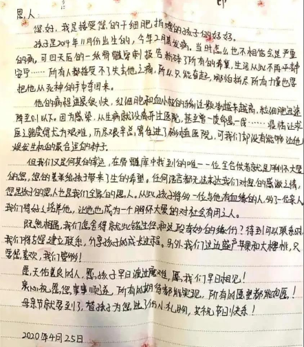在得到家人和单位的支持后,迂君迅速配合进行采血高分配型、全面体检。2020年4月28日早上8点,干细胞采集开始,两个针头分别扎入迂君两个胳膊的血管中,血液在机器中进行二十八个循环流转分离造血干细胞。三个多小时后,终于采集完毕,医生将采集的血袋装箱,迅速送往患者所在的医院。捐献当天,迂君收到了来自患者母亲的感谢信,以及天津市红十字会和中国造血干细胞捐献者资料管理中心颁发的荣誉证书,而在迂君看来,能挽救生命,比什么都重要。配型成功的概率几乎百万分之一,迂君为这个孩子和家庭带来了“生”的希望。
