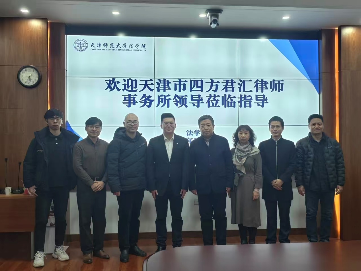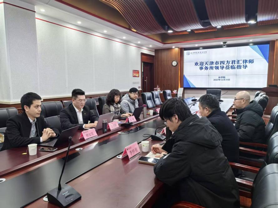 2025年12月10日,天津四方君汇律师事务所陈武钟主任一行来我院座谈交流。四方君汇律师事务所政府业务部主任高爽,高级合伙人韩康、赖如星,我院党委副书记、院长郝磊,党委委员、副院长郭明龙,教师晁晓军、李梓晨出席座谈。