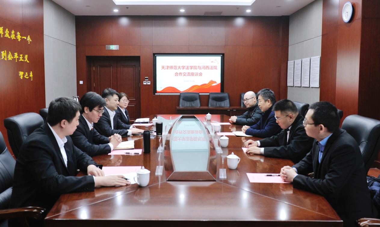 1月29日上午,郝磊带队赴河西区人民法院走访交流,我院党委副书记、纪委书记秦浩,党委委员、副院长郭明龙,刑法教研室主任王海军教授一同调研。河西区法院党组副书记、副院长孙政,审管办(研究室)主任肖宝清,审管办(研究室)副主任李硕,审管办(研究室)干部姬鹏等参加座谈交流。孙政对我院领导一行的到来表示欢迎,并指出河西法院与师大伟德国际VICTOR1946一直保持着紧密联系,希望未来将双方的合作关系进一步提升深化,以期更好推动双方的发展,实现互进共赢。郝磊对河西法院长期以来对师大伟德国际VICTOR1946发展所给予的支持表示衷心感谢,并从学科情况、人才培养、科学研究、社会服务等方面介绍了学院近年来的发展情况,表示师大伟德国际VICTOR1946期待在更深层次、更广泛领域与河西法院开展深入的合作交流。双方与会人员一致认为,协同育人是培养高素质法治人才的关键路径。我院提出将进一步优化学生实习管理、组织学生旁听开庭等系列建议,以期切实强化学生的法学实践体验,提升学生就业竞争力。河西法院领导表示,将进一步做好学生实习管理和服务,并在联合开展普法宣传、课题调研等方面与我院深化合作,以期构建协同育人的良性发展格局。
